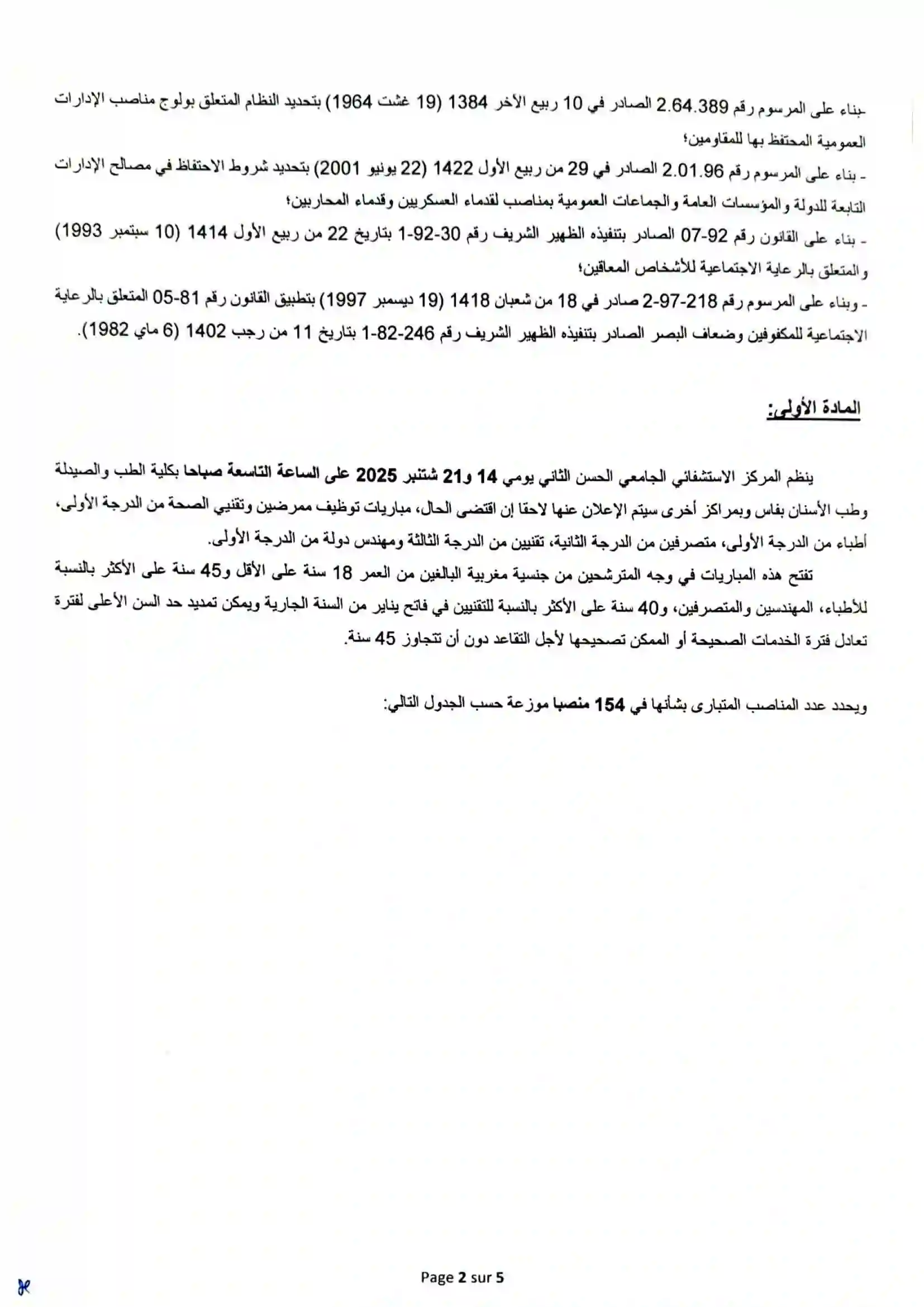 Le Centre Hospitalier Universitaire Hassan II lance un concours national pour recruter 154 nouveaux collaborateurs répartis comme suit :